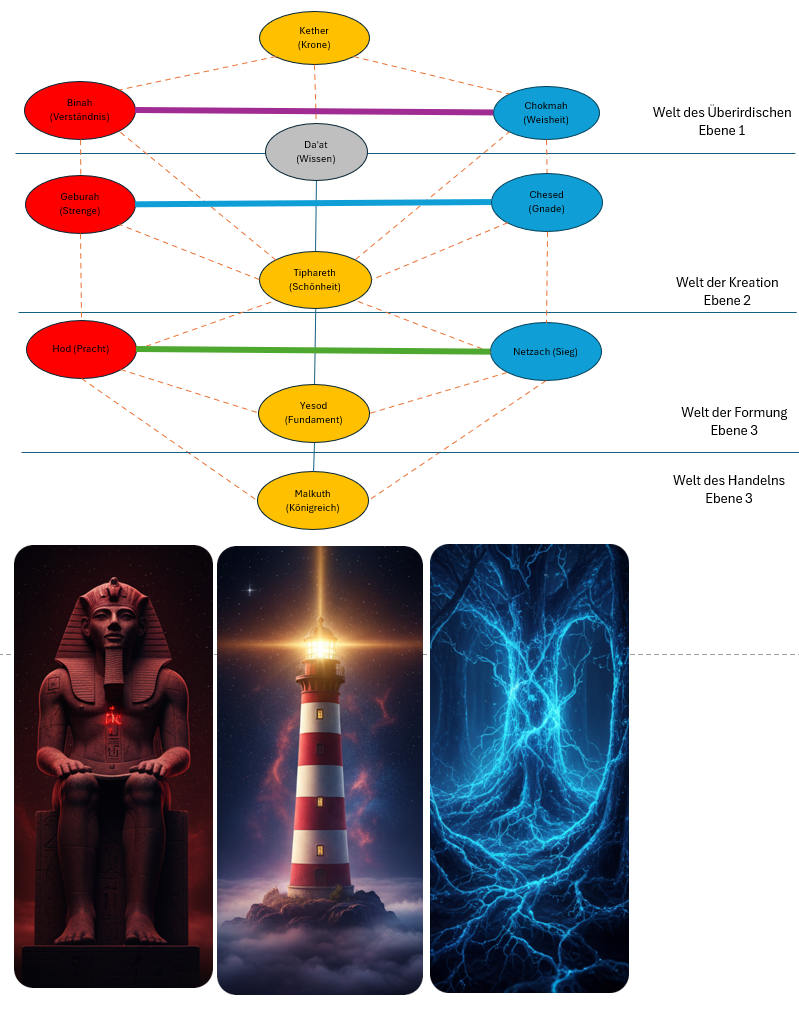 - Die 3 Säulen: Die Getriebe des Wasserfalls. Die Sephiroth sind in drei Säulen angeordnet, die den ewigen Tanz der Drei abbilden: Die Säule der Gnade (Myzel), die Säule der Strenge (Pharao) und die Säule des Gleichgewichts (Leuchtturm).
